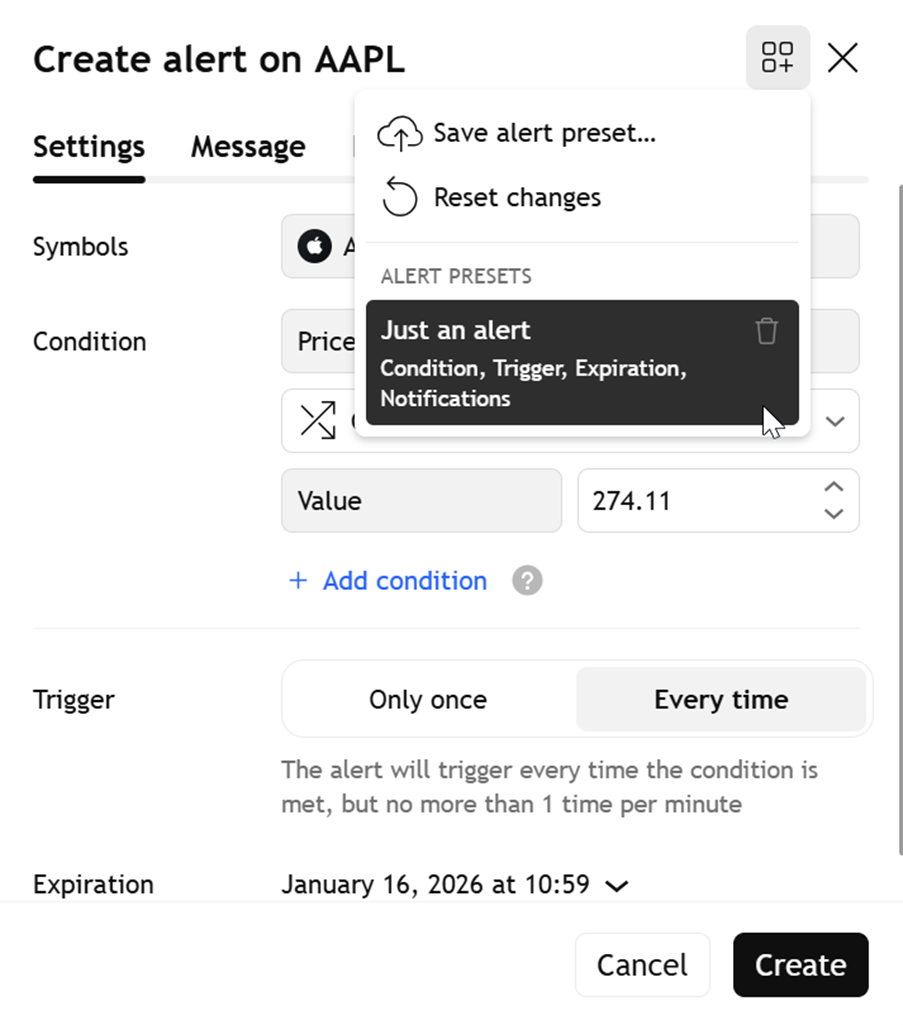 - Öffnen Sie das Dialogfenster für die Alarmerstellung