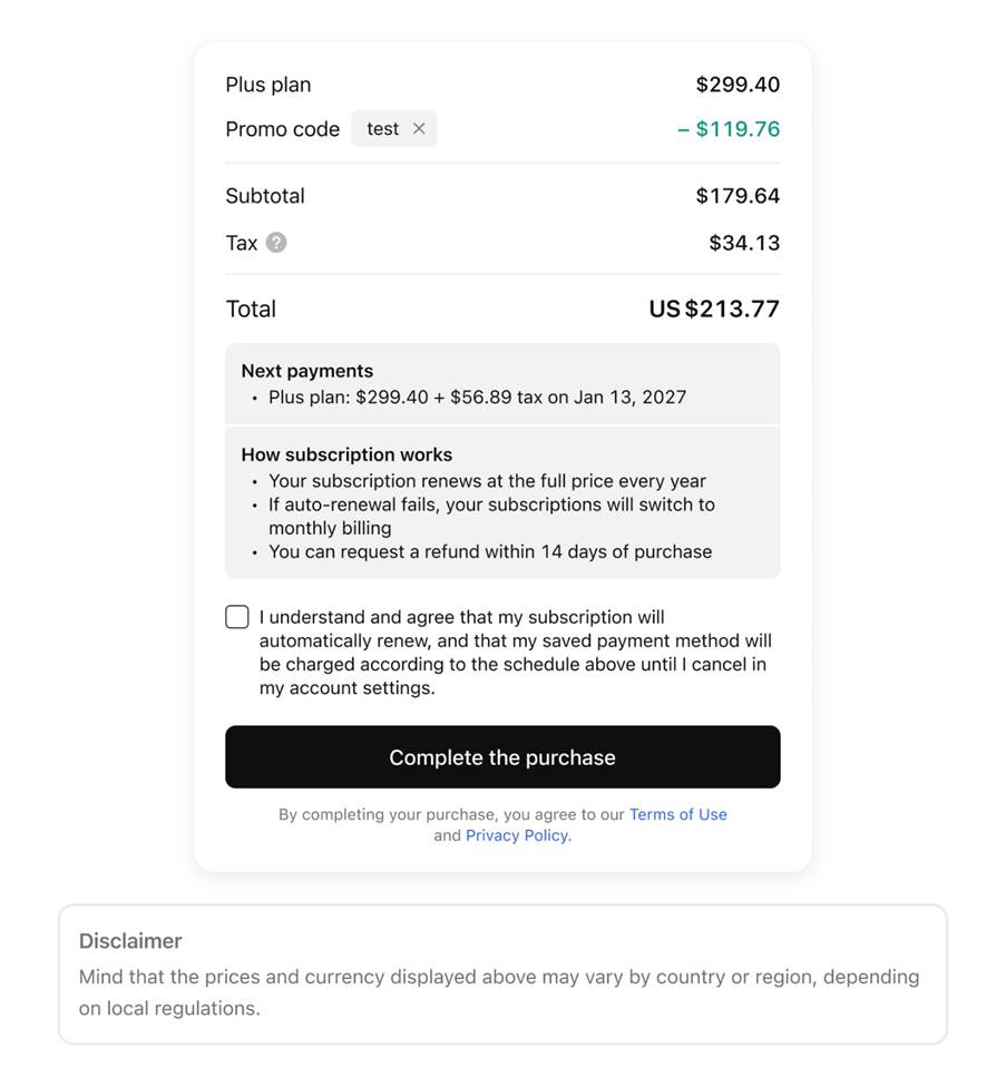 Nachdem Sie sich für ein Abonnement entschieden haben, werden Sie auf die Zahlungsseite weitergeleitet, wo Sie den Einkauf abschließen können.